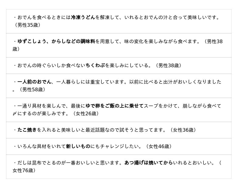 おでんを食べる季節や好きな具、購入時の重視点などについて聞いています。調査結果をお知らせいたします。