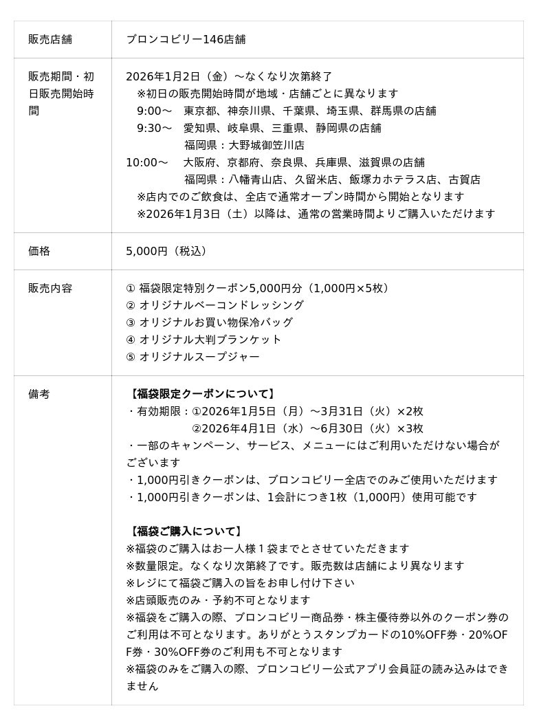 ステーキハウス ブロンコビリーを全146店舗展開する株式会社ブロンコビリー(本社:愛知県名古屋市 代表取締役社長:阪口 信貴)は、2026年1月2日(金)からブロンコビリー全店にて『ブロンコビリー福袋』の販売を各店にて開始します。5,000円分の福袋特別クーポンの他に、おウチでもブロンコビリーの味を楽しめるベーコンドレッシングにオリジナルデザインの大容量保冷バッグ、ふわふわの大判ブランケット、スープジャーのオリジナルグッズ3点を含めた、合計5点セットを税込み5,000円で販売いたします。また、福袋を購入されたお客様の中から合計2,850名様に豪華プレゼントが当たる「うまうまラッキーカード」も封入されています。