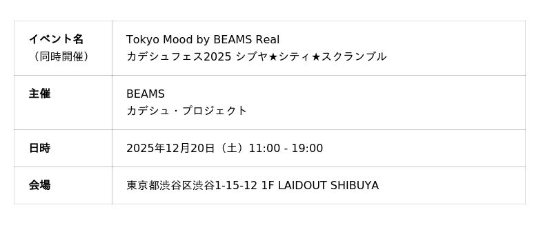 株式会社ビームス(本社:東京都渋谷区、代表取締役社長:設楽洋)は、ソーシャルVRプラットフォーム「VRChat」に常設したワールド「Tokyo Mood by BEAMS(トーキョー ムード バイ ビームス)」をテーマにしたイベント「Tokyo Mood by BEAMS Real(トーキョー ムード バイ ビームス リアル)」を、2025年12月20日に渋谷で開催しました。