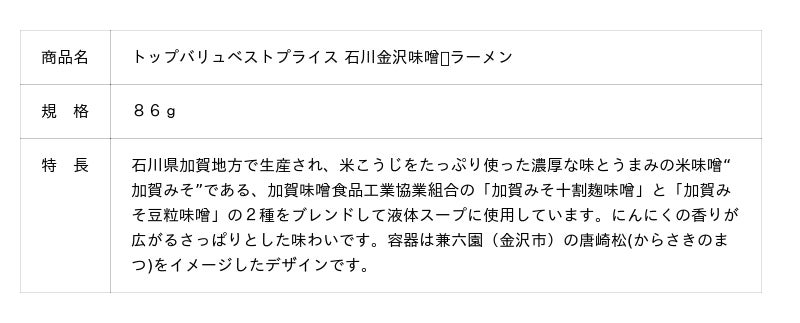 ・金沢を産地とし、全国でも愛されている「大野醤油」と「加賀みそ」を液体スープの原料としてそれぞれ使用