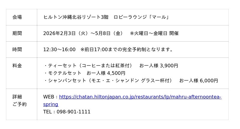 【2025年12月26日】ヒルトン沖縄北谷リゾート(北谷町(ちゃたんちょう)美浜(みはま) 統括総支配人 宍倉裕(ししくらゆたか))は、ロビーラウンジ「マール」にて、2026年2月3日(火)から5月8日(金)までの期間、火曜日から金曜日限定で『桜といちごのアフタヌーンティー』を提供いたします。春の訪れを感じる華やかなスイーツとセイボリーを堪能できる本フェアは、1日限定10名様でのご案内となります。