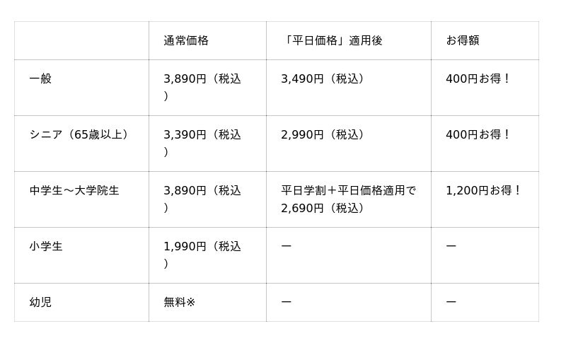 ※「平日価格」の対象は一般・シニア料金のお客様です。
