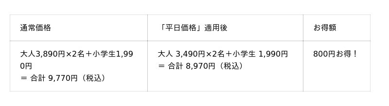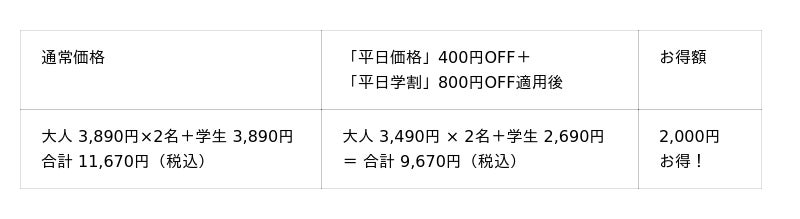 ※「平日価格」・「平日学割」はキャンペーン開催期間中の土日・祝を除く平日のみが割引適用となります。