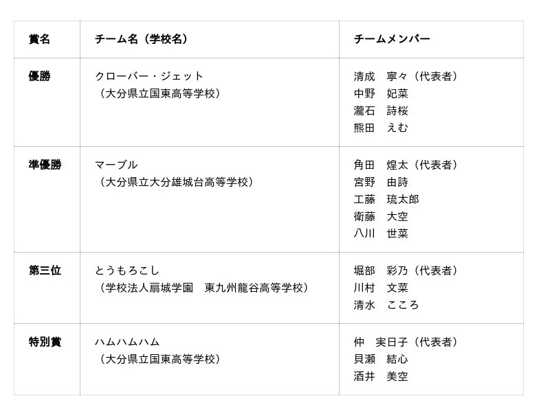 本イベントのメインプログラムとして開催された「宇宙甲子園ロケット部門 大分大会」には、事前参加登録した高校生6チームがエントリー。自ら設計・製作したモデルロケットを空高く打ち上げ、指定された高度への到達精度と、パラシュートによる定点着地、そしてプレゼンテーション技術を競い合いました。競技結果は以下の通りです。