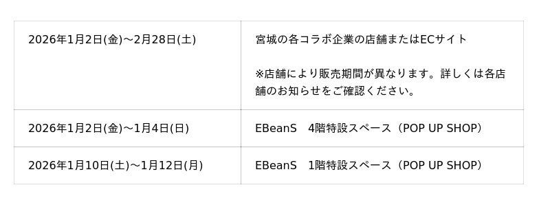 株式会社エンドーチェーン(本社:宮城県仙台市、代表取締役社長:遠藤大樹、以下「エンドーチェーン」)は、仙台駅前の商業施設「EBeanS(イービーンズ)」を中心に、2026年1月2日(金)・3日(土)の仙台初売り期間を起点として、北海道を応援するキャラクター「雪ミク」とのコラボレーション企画 「SNOW MIKU × EBeanS初売り」と「杜の都でコラボレーション!」 を開催いたします。