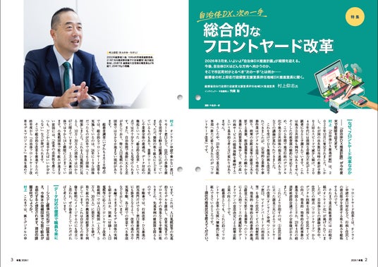 本号では、今春に期限を迎える『自治体DX推進計画』の次を見据えて、総務省自治行政局行政経営支援室・村上仰志室長へ「総合的なフロントヤード改革」の現状と展望を伺ったほか、先進事例として栃木県足利市と大阪府泉南市の取り組みをご紹介しています。