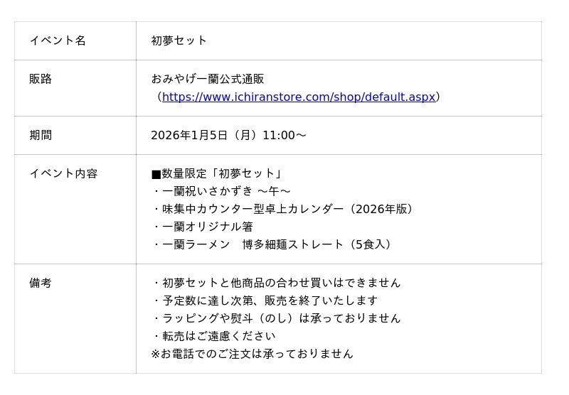株式会社一蘭は、2026年1月5日(月)11:00より、公式通販限定の「初夢セット」を数量限定で発売するとともに、お得な「おみやげ一蘭 新春初売」を同時開催いたします。