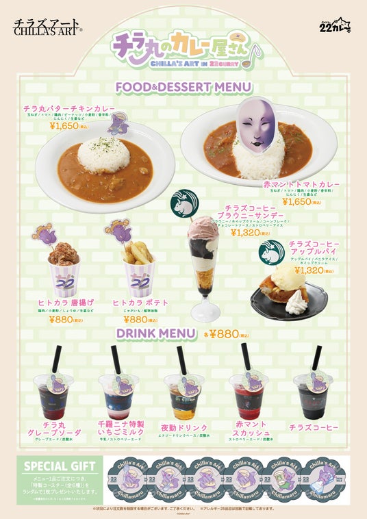 大人気ホラーゲーム「CHILLA'S ART」in 22カレーが開催決定!シェフ姿のチラ丸が皆様をお迎えするほか、新規描き下ろしグッズを多数ご用意しております。皆様のご来店をお待ちしております!
