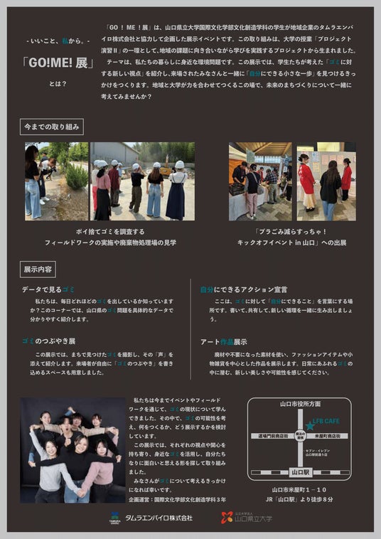 田村ビルズグループ(本社:山口県山口市)と山口県立大学は、産学連携によるPBL(Project Based Learning)活動の一環として取り組んできたプロジェクト成果を、展示イベント「GO!ME!展」として一般公開いたします。