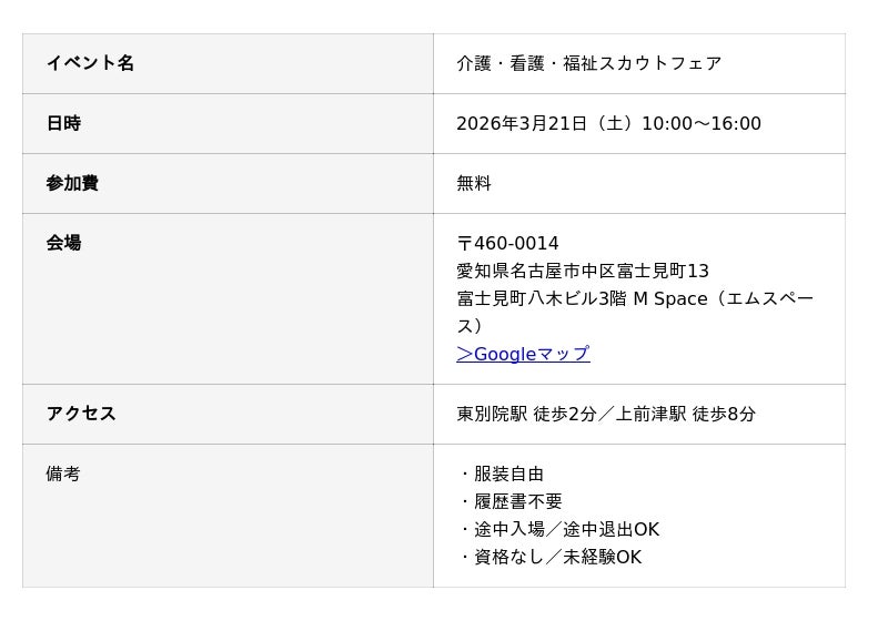 介護・看護・福祉施設と直接話せるスカウトフェアが名古屋市中区で開催。施設側からの説明を比較し、報酬や働き方を本音ベースで話せる、新しいスタイルの就職・転職イベント。履歴書不要・未経験者も参加可能。
