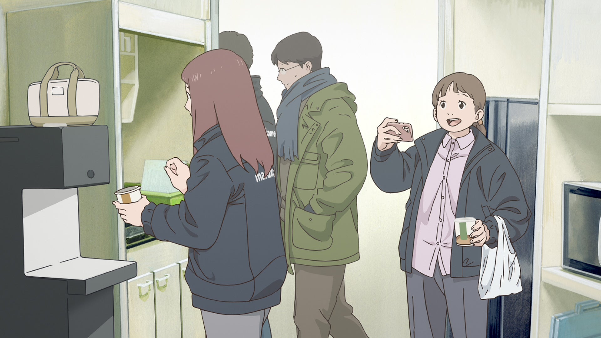 同僚がまいのスマホを持って画面を見ている。