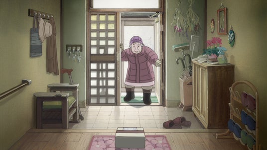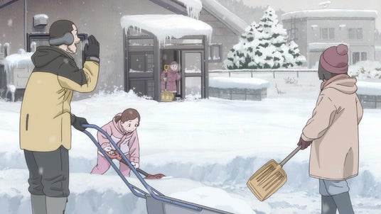 雪かきをしようと風除室の戸を開ける祖母に声をかける隣人。