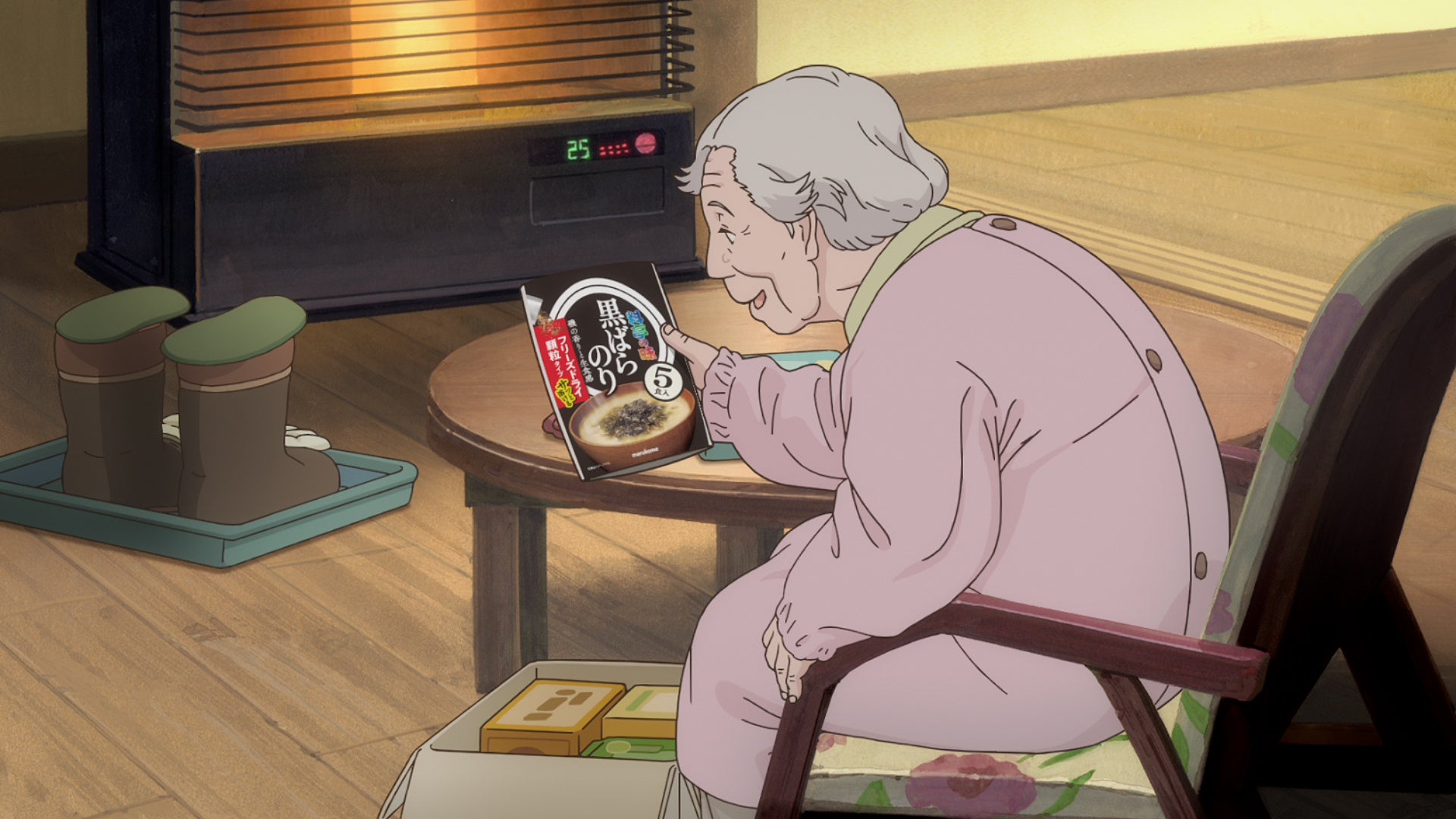 祖母の後ろ姿。作業台にしているちゃぶ台の上に荷物の箱とガラケーが置いてある。