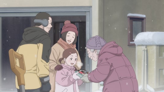 雪かきのお礼に隣人に顆粒みそ汁とお菓子をおすそ分けしているおばあちゃん。