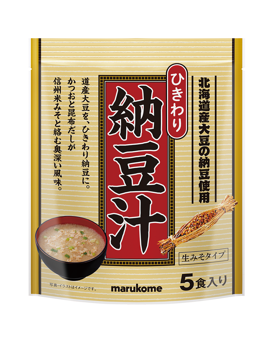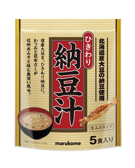 北海道産大豆を使用した生みそタイプの納豆汁です。しっかりした粘り気と香りの良いひきわり納豆。みそは淡色系の米みそを使用することで納豆の風味を引き立たせました。