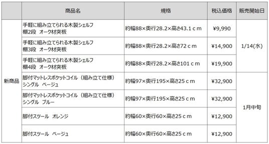 無印良品を展開する株式会社良品計画(東京都文京区/代表取締役社長 清水 智)は、新生活の時期にもおすすめの「手軽に組み立てられる木製シェルフ」シリーズ3種を、1月14日(水)から全国の無印良品の店舗およびネットストアで順次発売し、ベッドとしてだけでなくソファにも使いやすい「脚付マットレスポケットコイル(組み立て仕様)シングル ベージュ/ブルー」の 2種、および「脚付スツール オレンジ/ベージュ」の2種を1月中旬から数量限定で発売します。