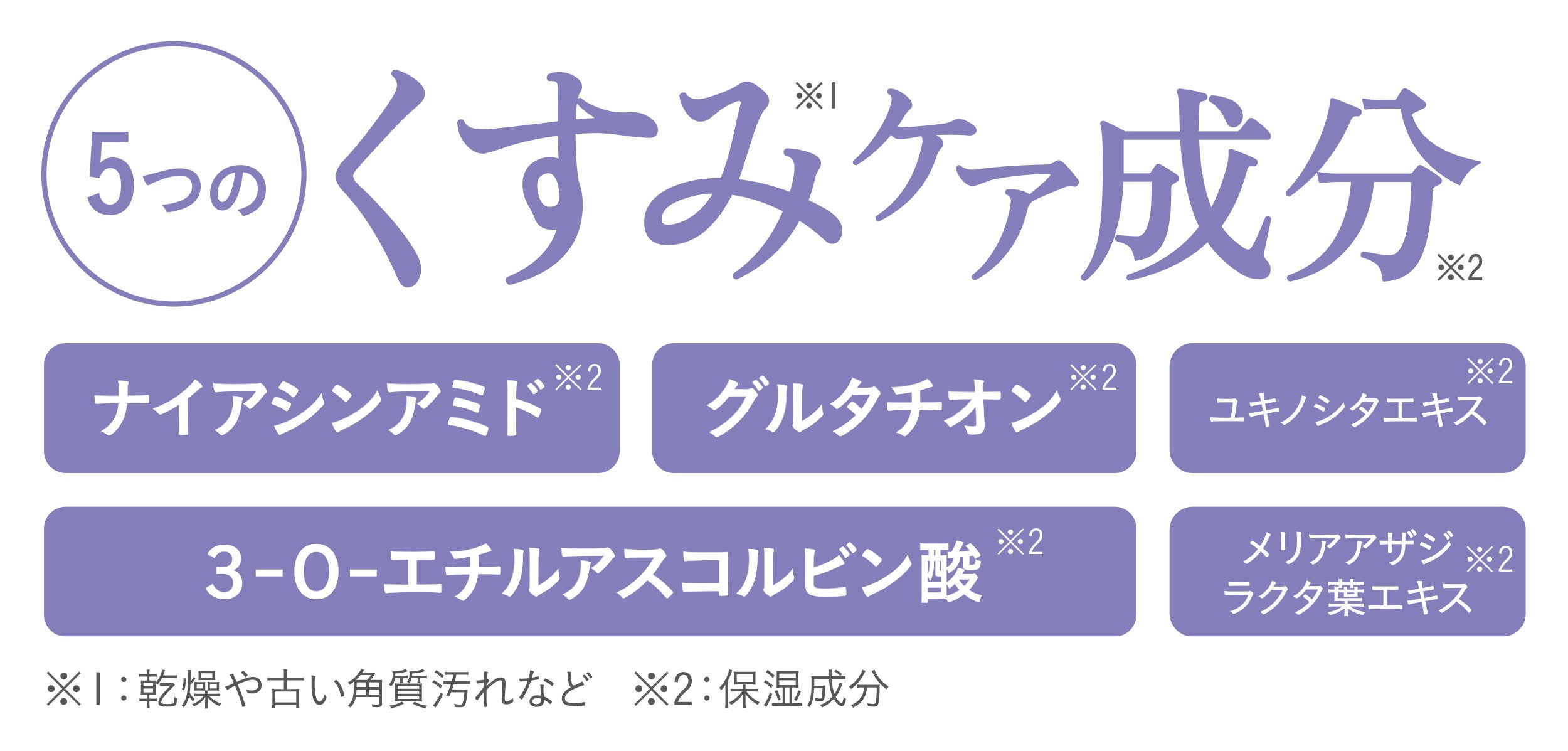 ナイアシンアミドやグルタチオンなどの5つのくすみ*¹ケア成分*²を配合。