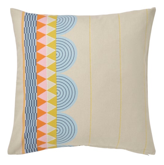 魅力的で穏やかなトーンの線、円、三角形を組み合わせた幾何学模様が印象的な、柔らかな綿のクッションカバーは、視線を引き付けること間違いありません。
