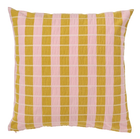 この柔らかな綿のクッションカバーは、異なる色のストライプが魅力的な模様はドビー織りによるもので、立体的な独特の風合いとナチュラルなシワが特徴です。明るい色使いの楽しい模様で、目に心地よく、柔らかな使い心地です。