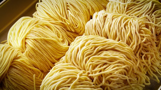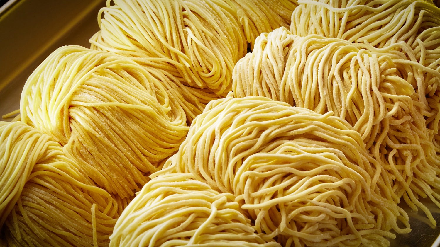 【こだわり2. 自家製麺】特製の小麦粉を使い、小麦本来の豊かな香りとコシを感じる麺。多加水でコシの強い細ストレート麺または中太ちぢれ麺は豚骨スープと相性抜群です。