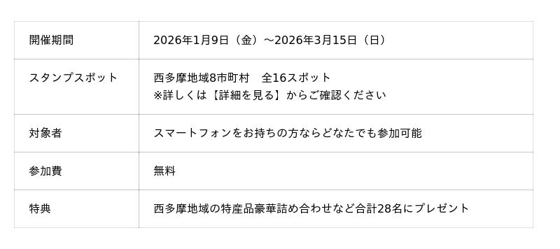 一般社団法人 日本自動車連盟(JAF)東京支部(支部長 加藤和夫)は、西多摩地域広域行政圏協議会が主催する「『まるで東京じゃない東京へ旅をしよう』西多摩地域ドライブスタンプラリー」(開催期間:2026年1月9日(金)~2026年3月15日(日))を、帝京大学産学連携推進センターおよび経済学部小笠原ゼミと連携し開催に協力します。