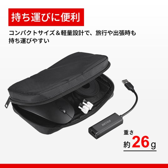 USB 3.2(Gen 1)インターフェースを搭載することで、GigaのLANポートの性能を最大限活かした高速通信を実現できます。大容量のデータのダウンロードが高速になるだけでなく、有線接続による安定した通信が可能となり、動画視聴やインターネットの閲覧が快適になります。接続すると搭載されたLEDランプが点灯し、通信状況を一目でチェックできます。持ち運びに便利な手のひらに収まる小型・軽量タイプです。