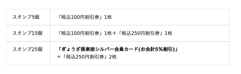 集まったスタンプの数に応じて、お会計が毎回5%割引になる「ぎょうざ倶楽部シルバー会員カード」や各種割引券と交換できます。