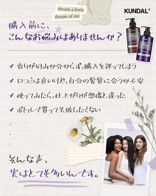 KUNDALは、自社商品に自信があるからこそ、「一度使えば、使い続けたくなる」ヘアケア商品だと考えています。まずは、気軽に無料サンプルを試してみて、「好き」と感じた方は、お得にKUNDAL商品を購入してみてください。