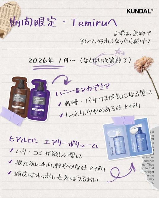 グローバルライフスタイルブランドKUNDAL(クンダル)は、2026年1月から日本の無料サンプリングお取り寄せサイト「Temiru(テミル)」にて、KUNDALの人気ヘアケア商品の無料サンプリングを開始いたします。