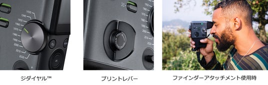 カメラ本体は、黒とグレーを基調にしたクラシックで高級感のあるデザインで、当社が1965年に発売し、誰でも簡単に日常を動画に残せる画期的なホームムービーシステムとして人気を博した8mmカメラ"フジカ シングル-8"を彷彿とさせる縦持ちスタイルを採用しました。指先に伝わるクリック感が魅力の「ジダイヤル(TM)」や、フィルムを手で巻き上げるような感覚で操作できる「プリントレバー」など、細部にまでこだわったデザインとアナログな操作感で撮影とプリントの楽しみを広げます。