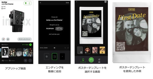 専用アプリ(※2)では、撮影した動画を組み合わせて編集したり、映画のようなオープニングやエンディングのテンプレートを追加でき、動画をより特別に仕上げることが可能。さらに、「ダイレクトプリント機能」を搭載し、スマホの画像をチェキプリント(TM)にできます。