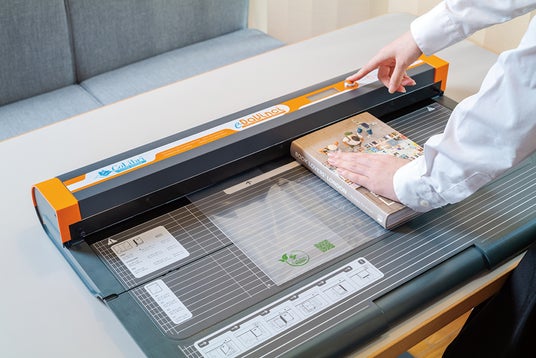 ●糊のいらないブックカバー・コリブリカバーシステム体験コリブリカバーシステムは、糊で貼らない透明なブックカバーを書籍にぴったりの大きさで簡単につくることができます。ソフト・ハードカバー本・雑誌などカバーする資料を選びません。
