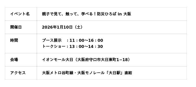 100円ショップや雑貨店など全国1,900店舗以上を運営する株式会社ワッツ(本社:大阪府大阪市中央区、代表取締役:平岡史生)は、2026年1月10日(土)に大阪府守口市のイオンモール大日にて開催される親子向け防災イベント「親子で見て、触って、学べる!防災ひろば in 大阪」 に出展いたします。
