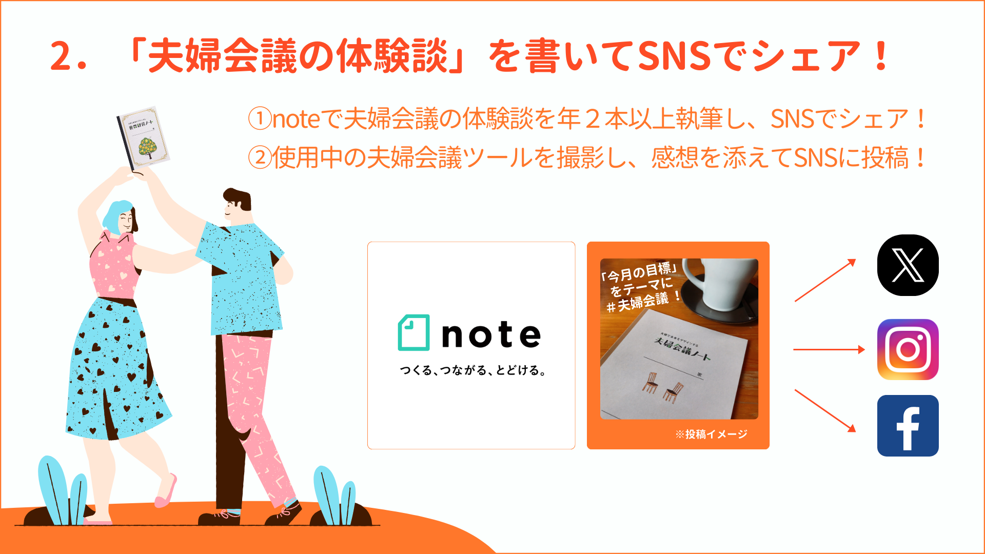 noteで『夫婦会議』の体験談を1年間に2本以上書いて、ご自身のSNSで発信いただきます。