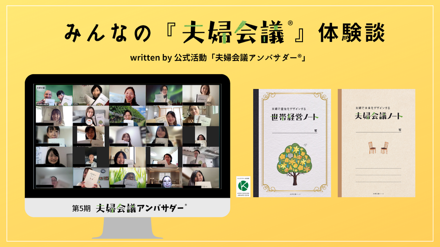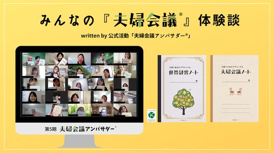 「夫婦会議アンバサダー」とは、世帯経営ノートや夫婦会議ノートなどの夫婦会議ツールを使って、実際に『夫婦会議』を行う中で感じた効果や魅力、楽しさを、ご自身の体験と共に積極的に発信いただく『夫婦会議』の公式活動です。