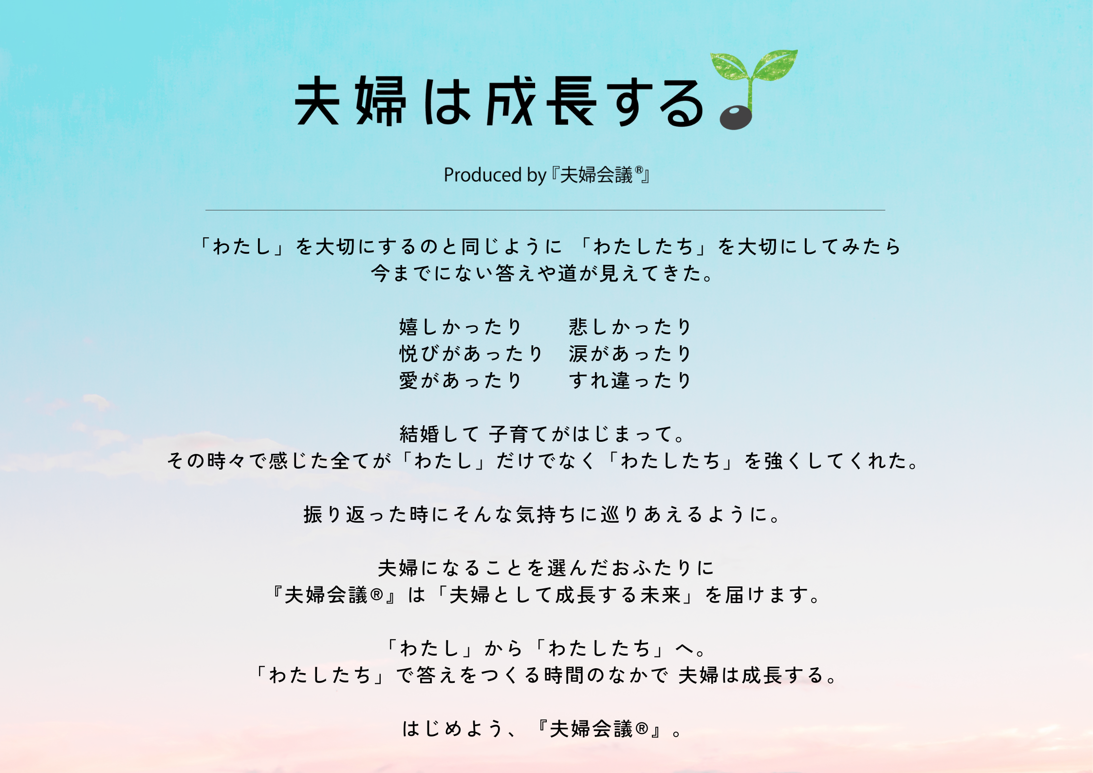そんな願いと確信を『夫婦会議』のブランドコンセプトに込めて、今年も『夫婦会議』は、夫婦になることを選んだおふたりに「夫婦として成長する未来」をお届けします。