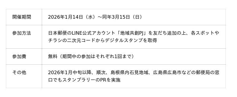 ※3:日本郵便が一般社団法人石見銀山みらいコンソーシアム(島根県大田市大森町、代表理事:松場 忠、渡邊 哲也)と共同で、石見銀山エリアの観光施設や店舗などを対象に、2025年10月15日から2026年2月13日(金)まで開催しているデジタルスタンプラリー第三弾