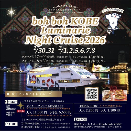 「boh boh KOBE ルミナリエNight Cruise 2026」開催決定!船上から神戸ルミナリエを眺める贅沢で特別な感動体験を♪