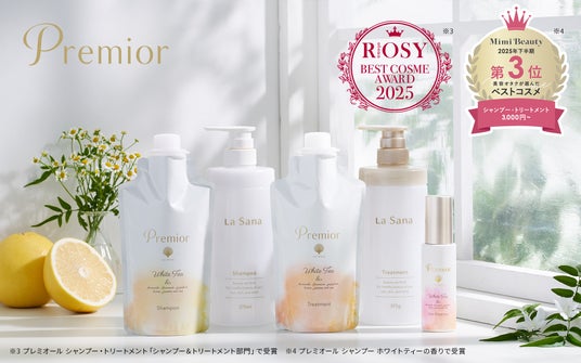 ヘアトリートメント カウンセリング 国内売上No.1(※2)の海藻コスメブランド「ラサーナ」を展開する株式会社ヤマサキ(本社 : 広島市、代表取締役 兼 CEO : 土肥 光)は、慢性的なくせ・うねり髪の悩みにアプローチするラサーナダメージヘアケアのプレミアムライン「La Sana Premior(ラサーナ プレミオール)」シリーズにおいて、ベストコスメで累計15冠を達成(※1)いたしました。2025年2月のリニューアル発売以降、多くのお客さまから高い評価をいただき、2025年下半期には同年9月発売のホワイトティーの香りでもベストコスメを受賞いたしました。