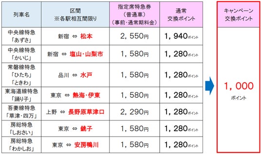 最大で通常ポイントの約半分!一律1,000ポイント(通常1,280~1,940ポイント)の大変おトクな区間!例えば「新宿~松本」間の特急あずさは、通常1,940ポイントのところ、今なら1,000ポイントで交換可能です。