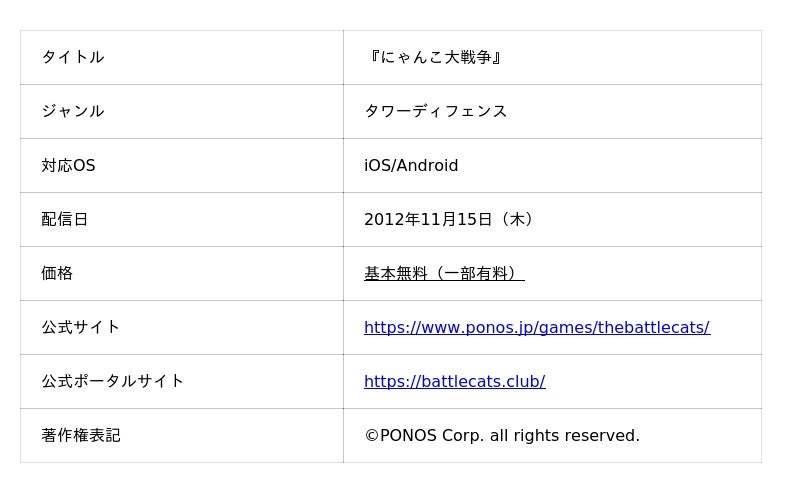 『にゃんこ大戦争』は、iOS・Android向けタワーディフェンスゲームです。プレイヤーは様々な能力を持つ「にゃんこ」たちを編成して、各地を侵略していきます。2012年のリリース以来、個性的なキャラクターや独特の世界観が、日本のみならず世界中の多くのお客様にご支持をいただいています。今後も多様なメディア展開やコラボレーションを積極的に行ってまいります。