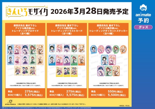 2026年3月28日(土)~2026年4月12日(日)のイベント開催期間中、アニメイト対象店舗(通販のぞく)にて『きんいろモザイク』関連のキャラクターグッズをご購入1,100円(税込)毎に、店舗購入キャンペーン特典「ポストカード(全6種)」を1枚プレゼント!