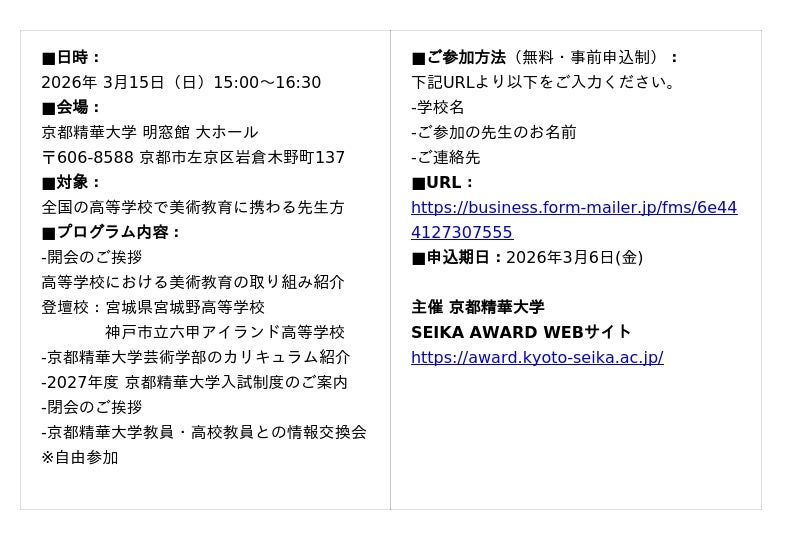[京都精華大学]高校生のための創作作品コンペティション SEIKA AWARD2026 特別企画「高大美術教育研修会」開催