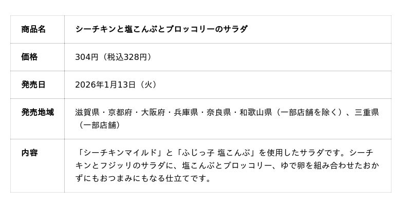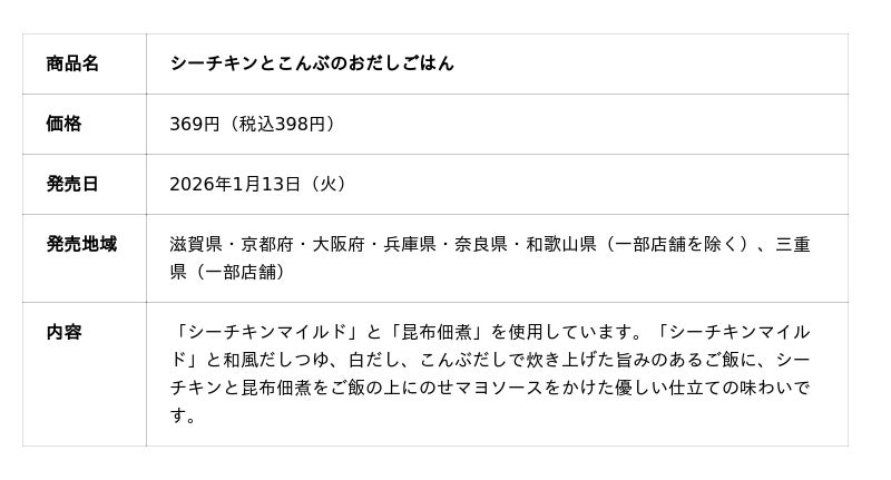 はごろもフーズ株式会社(本社:静岡県静岡市 社長:後藤佐恵子)は、 株式会社ファミリーマート(本社:東京都港区、代表取締役社長:細見研介、以下「ファミリーマート」)、フジッコ株式会社(本社:兵庫県神戸市、代表取締役社長執行役員:福井正一、以下「フジッコ」)とコラボレーションしたオリジナル商品3種を2026年1月13日(火)から滋賀県、京都府、大阪府、兵庫県、奈良県、和歌山県(一部店舗を除く)、三重県(一部店舗)のファミリーマート約2,600店にて発売します。