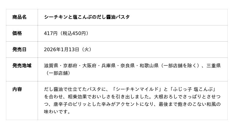 地域の皆様に馴染み深い「だし」の旨みをベースに、はごろもフーズ様の「シーチキンマイルド」とフジッコ様の「塩こんぶ」「昆布佃煮」という、食卓に欠かせない素材の美味しさを最大限に引き出した商品が完成しました。旨みの相乗効果を感じていただけるお弁当、パスタ、ちょいデリの3品を、ぜひこの機会にお楽しみください。