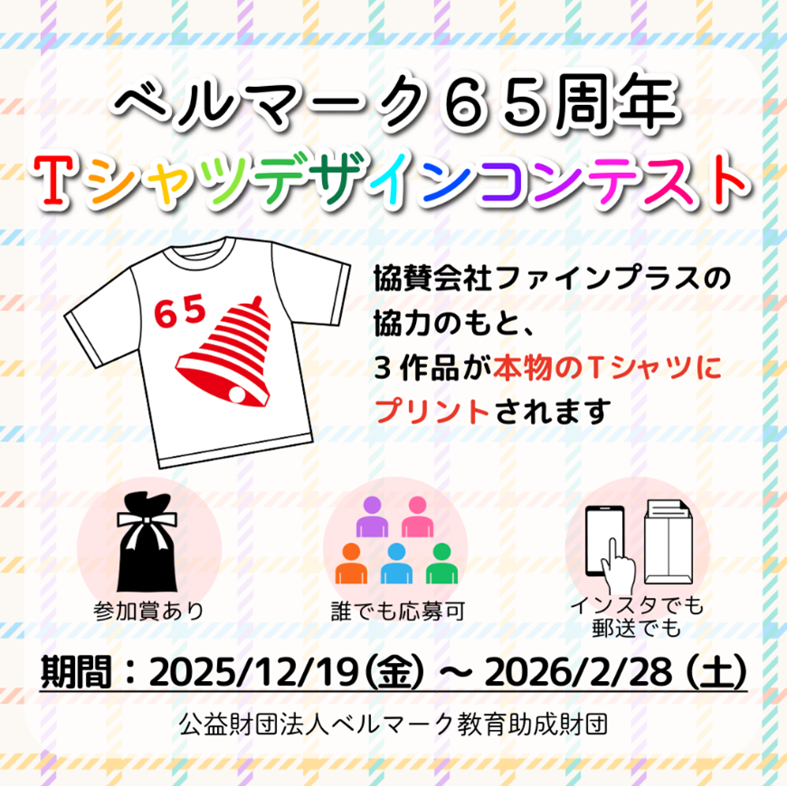 65 周年を迎えたことを記念して「T シャツデザインコンテスト」を開催しています。募集期間は2025 年12月19 日(金)から2026 年2 月28 日(土)までです。金賞に選ばれた作品は、デザインをプリントしたオリジナルT シャツを実際に製作して贈呈します。副賞は財団の公式キャラクター「ベルマーくん」のぬいぐるみです。