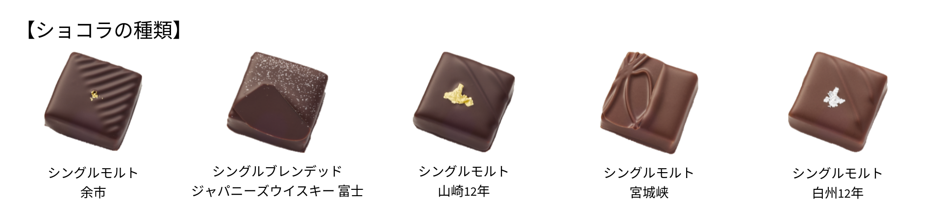 日本の気候と風土が凝縮された味わいが多様な個性をもって表現されるジャパニーズクラフトウイスキー。それぞれの理想を掲げ、自由でオリジナリティあふれるウイスキーが日本各地で続々と生みだされています。カカオ豆から手掛ける自家製チョコレートをバランス良くブレンドし、それぞれのウイスキーの特徴を際立たせ、カカオの香りとの相乗効果を楽しめるショコラに仕上げました。