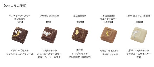 世界自然遺産の島・屋久島で熟成されたウイスキーや、北海道 厚岸のテロワールから育まれるピート香が特徴のウイスキー、鹿児島産大麦を自社製麦して造るメローなウイスキーなど、地域ごとの自然環境が織りなすおいしさを詰め込んだショコラBOX。ウイスキーとショコラ、それぞれの深みと余韻が響きあうマリアージュをお楽しみください。