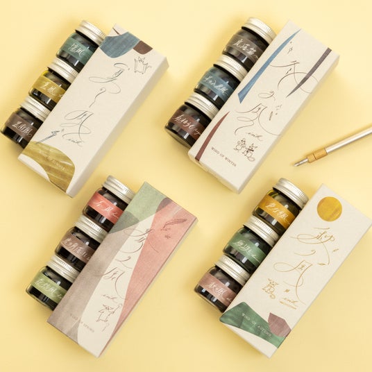 真鍮製の高級感あるつけペン本体と、別売りの「春の風」など四季をテーマにした3色のインクセット。