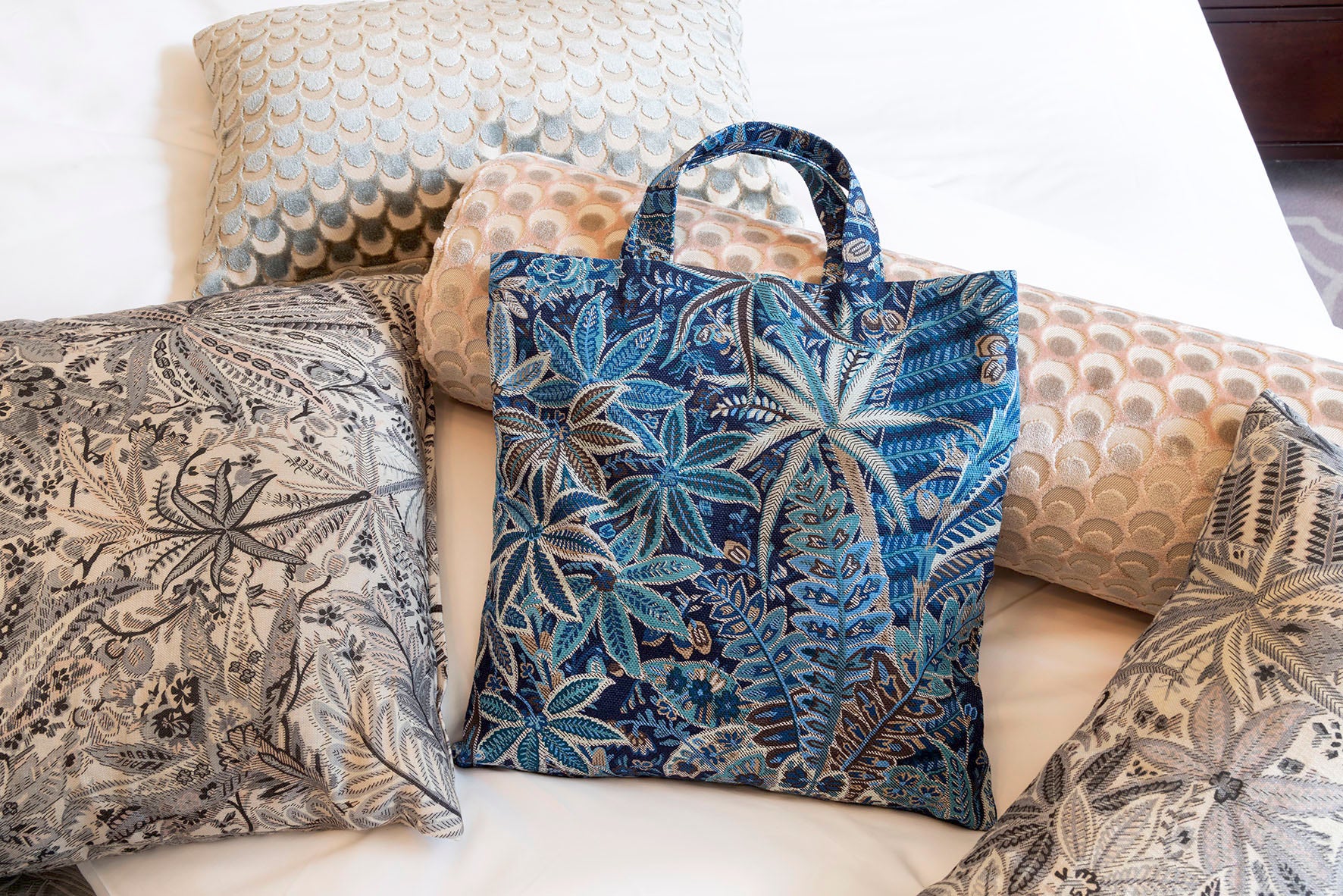 このプランのためにLIBERTYファブリックで製作されたホテルオリジナルのトートバッグ。テキスタイルは2つのコンセプトルームにも採用されているPersian Voyage(ペルジャン ヴォヤージュ)で、LIBERTYアーカイブのショールデザインコレクションから再構築されたものです。HERA(ヘラ)のベッド上のクッションと、JADE(ジェイド)のベッドスローにも色違いのPersian Voyageを見つけていただけます。A4サイズがすっきり収まり、内ポケット付きで実用性も抜群。LIBERTYの美しさを日常に取り入れられる、数量限定の特別アイテムです。